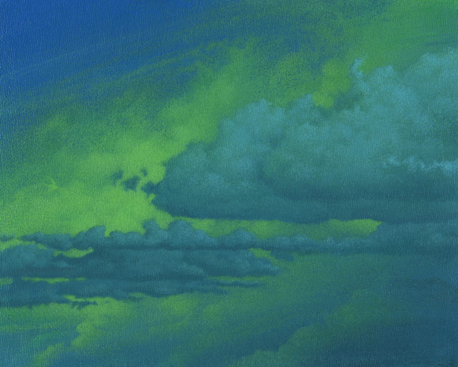 Massive lime clouds back-lighting the foreground stack. Framed with ultra-thin 8th inch black anodized metal.